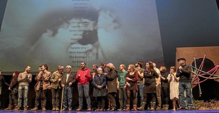 Las personas que llenaban el Auditorio aplaudieron cada una de las intervenciones, pero el momento más emotivo llegó cuando se representó el momento de la muerte de Solaguren mediante una coreografía preparada para este homenaje. Al mismo tiempo, se proyectaron imágenes del funeral, con Ekain exposado despidiéndose de su madre.