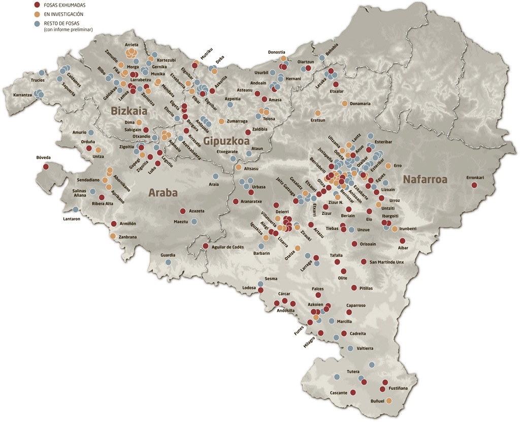 Detrás de un mapa de las fosas del franquismo hay mucho más que un gráfico de localización de la barbarie. El mapa relata también una historia de ocultación, documenta vidas y otorga el necesario impulso oficial que precisa un terreno hasta ahora poco transitado por los poderes oficiales en el Estado español. La Ley de Memoria Histórica obliga a las administraciones a que elaboren sus respectivos mapas. El Gobierno de Nafarroa lo hizo en el año 2013 (http://fosas.navarra.es) y, recientemente, el Ejecutivo de Gasteiz ha puesto el suyo a disposición de la ciudadanía (http://www.lehendakaritza.ejgv.euskadi.eus/memoria-historica). Este último ha visto la luz auspiciado por el plan de acción que contempla el convenio de colaboración con Aranzadi, sociedad científica pionera y referencial en los trabajos de localización, documentación y exhumación de fosas.