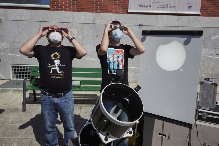 MAR. 27 2025 - 11:36h Eclipse: ensayo general Si las nubes lo permiten, este sábado se podrá observar un eclipse parcial de Sol, una especie de ensayo para el espectáculo que supondrá este mismo fenómeno, pero con carácter total, el próximo 12 de agosto de 2026. Para observarlo, hay que tomar serias precauciones. Dos personas observan en Iruñea el eclipse parcial de sol de 2021. (Eduardo SANZ | EUROPA PRESS) Javier Armentia (astrofísico y comunicador científico) Antes, cuando un suceso astronómico tenía relevancia en nuestra comunidad foral, desde el Planetario de Pamplona enviábamos una nota de prensa con información, organizábamos actividades y convocábamos a la ciudadanía, porque hemos estado siempre convencidos de la importancia de mirar al cielo y de preguntarnos por nuestro mundo. Ahora son otros tiempos sin Planetario en Pamplona, pero me mueve el mismo afán: no perder la oportunidad de que la ciencia tenga presencia y voz, especialmente cuando las circunstancias son propicias... Y esto es lo que sucede este sábado: la Luna se paseará por delante del Sol (un poquito solamente) en un eclipse parcial que nos sirve de ensayo general para lo que va a suceder el año que viene, cuando el 12 de agosto de 2026 la Luna oculte por completo nuestra estrella y se haga en un momento de noche total. Los eclipses han fascinado siempre a todas las culturas, porque eso de que en pleno día se haga de noche siempre sorprendió y hasta atemorizó a la gente. Pero es todo cosa de mecánica celeste, de cómo se mueven en el cielo el Sol y la Luna y los demás planetas marcando una especie de reloj cósmico que nos ha permitido a los humanos disponer de calendarios, de orientaciones y de relojes. De vez en cuando, nos cuenta la astronomía, la Luna oculta al Sol, y otras veces es la Tierra la que oscurece durante unas horas a la Luna. Los eclipses se pueden calcular y se hace desde hace más de 20 siglos, así que no podemos usar como excusa que no lo sabíamos para tenerlos en cuenta. Lo que pasa es que no siempre se ven desde un cierto lugar de la Tierra. A pesar de que hay entre dos y siete cada año, solamente en algunas regiones de nuestro planeta se pueden observar, especialmente los de Sol. Y no deja de tener cierta lógica: el Sol y la Luna son dos cuerpos radicalmente diferentes. El primero es nuestra estrella, con millón y medio de kilómetros de diámetro. La otra es nuestro satélite, con un diámetro de menos de 3.500 kilómetros, cuatrocientas veces más pequeña que el Sol, pero cuatrocientas veces más cerca, así que su tamaño es similar. Por eso suceden los eclipses. También porque la órbita de la Tierra en torno al Sol y la de la Luna alrededor de la Tierra están casi en el mismo plano, separadas solamente 5 grados. Si estuviéramos en el mismo plano, cada mes tendríamos un eclipse de Sol (coincidiendo con la luna nueva) y un eclipse de luna (en el plenilunio). Pero al estar algo separados, a veces la Luna pasa por encima o por debajo del Sol y no nos enteramos. Fases de un eclipse solar total visto desde la Isla de Pascua. (Jaime IZQUIERDO / EUROPA PRESS) Quizá por esa razón el más sabio de los siete sabios de Grecia, como se conocía a Tales de Mileto, que vivió entre el siglo séptimo y el sexto antes de nuestra era, tuvo tanto trabajo al predecir el primer eclipse el 28 de mayo del año 585, que coincidió además con una batalla. Tales les convenció, por aquello del fenómeno, de que dejaran de pelear y firmaran un armisticio. También en China sabemos que un eclipse generó en aquella época un juicio porque quienes deberían haberlo predicho se habían emborrachado. En estos miles de años, los eclipses han ido acumulando historias que nos recuerdan cómo han impresionado siempre esos momentos en que se hace de noche en pleno día. Eclipse parcial o eclipsito No va a ser este el caso el sábado. Se trata de un eclipse solar parcial: la Luna pasa por delante del Sol, pero solo oscurece una parte de su disco. Visto desde Navarra, en el momento de máximo eclipse, un 20% del Sol quedará desaparecido, una especia de uña en la parte superior que va a provocar que el Sol esté menos luminoso que otras mañanas. Pero no se hará de noche ni se verán las estrellas, como sucede en los eclipses totales. Este eclipse parcial se ve en una región del mundo que cubre principalmente Groenlandia y el Norte de Canadá y el Atlántico norte, pero también la región occidental de Europa. Dependiendo del lugar, la hora del máximo cambia, pero podemos tomar como referencia las 11:46 como el momento de mayor eclipse. Este se iniciará cuando la Luna comience a pasar por delante del Sol, según miremos el disco solar desde la parte superior derecha, sobre las 10:54. Irá pasando por delante hasta el final del eclipse, cuando el Sol solamente tendrá ocultada la parte superior izquierda de su disco, a las 12:39. (Las horas varían un poco dependiendo del lugar geográfico. Recomendamos las páginas del Observatorio Nacional, del Instituto Geográfico Nacional, como referencia para las efemérides. Igualmente en diversas páginas y aplicaciones uno puede tener los datos locales, no olvidemos que el cálculo preciso de los eclipses tiene ya cientos de años de tradición, no es algo que sea poco preciso...) Observación segura Mirar directamente al Sol es MUY PELIGROSO. Lo hemos puesto en negrita porque, por mucho que se repita, es poco. La tentación de mirar al Sol sin protección durante un eclipse es la mayor causa de daños oculares relacionados con la observación astronómica. El año pasado, cuando hubo un eclipse total de Sol recorriendo Estados Unidos el 8 de abril de 2024, aunque se había anunciado y avisado por las autoridades y los medios de comunicación, hubo muchas asistencias sanitarias a personas que, a pesar de todo, no habían tenido en cuenta que nunca se debe mirar al Sol directamente, ni siquiera con gafas de sol o con una radiografía. Una 
