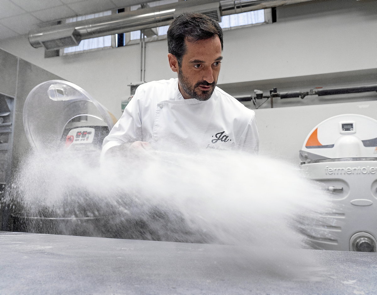 Formado en cocina en distintos lugares, también en la academia Aiala, propiedad de su familia, hace casi trece años puso en marcha un obrador en el que hoy en día trabajan veinte personas. Había llegado el momento de ampliar horizontes, comprar amasadoras más grandes, fermentadoras y un horno a la altura. Posteriormente, terminó abriendo tres céntricas panaderías-pastelerías: dos en Donostia y una en Zarautz bajo la denominación JA, sus propias iniciales, y la onomatopeya de la risa, un nombre que invita a sonreír.