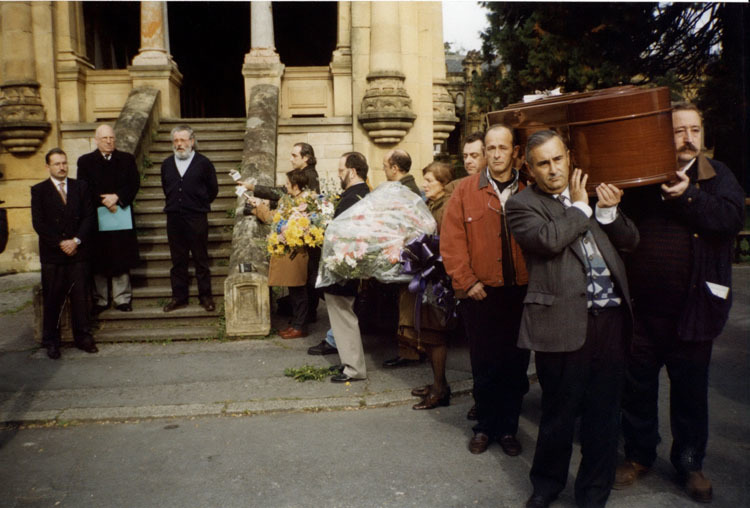 El 17 de noviembre de 1998 Krutwig es despedido con una ceremonia civil en el cementerio de Derio.  De izquierda a derecha: Manuel Antonio Federico Etxabe, Jean Haritxelhar, Xabier Amuriza y Patxi Goenaga. Llevando la caja: Juan José Puiana, Andolin Eguzkitza, Xabier Kintana y Txema Larrea. Fotografía: Euskaltzaindia