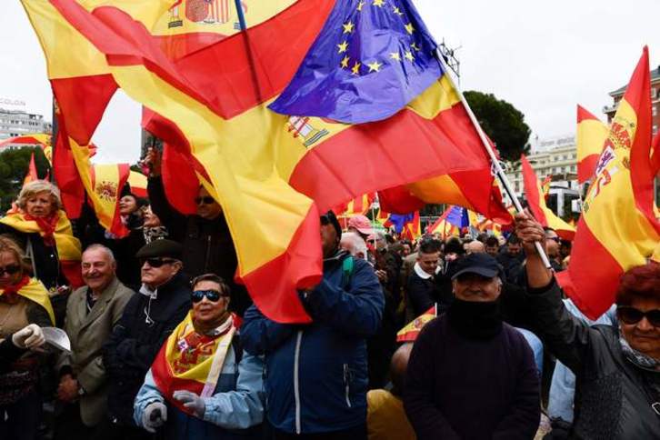 La concentración ha estado llena de banderas españolas. Ha habido decenas de miles de participantes en la Plaza de Colón, pero las primeras estimaciones apuntan a un pinchazo histórico. La Delegación del Gobierno la ha cifrado en 45.000.