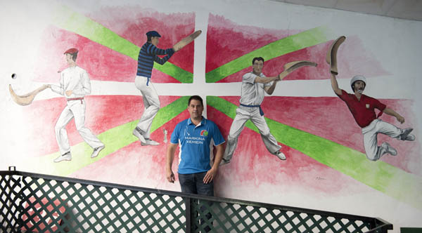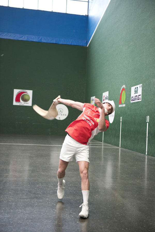 Aun así sigue entrenando, disputando partidos como aficionado y sin tirar la toalla: «Todavía tengo una pequeña esperanza para ir, pero está difícil. Lo único que he oído desde pequeño son historias de allí. Si algunos nacen con un pan debajo del brazo, nosotros nacemos con una cesta. Con lo conocida que ha sido en todo el mundo, es una pena que se pierda. ¡Y pensar que antes todos esos estaban llenos»! Lo dice señalando la colección de fotografías de frontones colgadas junto a la barra del bar, que llegaron a ocupar imponentes edificios en ciudades de Europa, Asia y América. Desde Shanghai a Nueva York pasando por Milán o México –este último se ha reabierto y ha vivido una temporada de cuatro meses que está a punto de finalizar–, sus estampas rememoran el lema que acompaña al mapamundi unos metros más arriba: «Zesta puntuan munduan zehar».