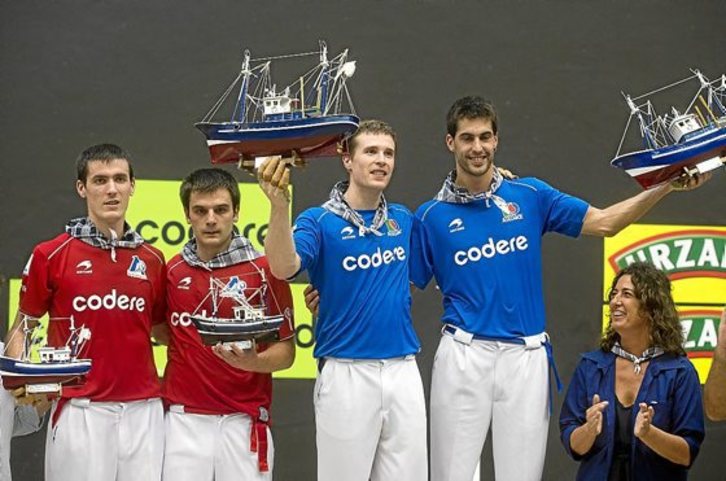 06 SET. 2018 Pelota Iñaki Artola sigue sin alcanzar su techo particular El de Alegia y un Larunbe de menos a más se hicieron con el título de Lekeitio ante Elezkano II-Rezusta. Jon ORMAZABAL ELEZKANO-REZUSTA 18 ARTOLA-LARUNBE 22 Tras haber jugado como zaguero de los mejores delanteros de su empresa, no se atrevía Mikel Larunbe a decir si el Artola actual es el mejor compañero con el que ha jugado, pero sus declaraciones tras refrendar el torneo de Lekeitio que el año pasado ganó con Urrutikoetxea son la mejor descripción del estado actual del alegiarra. «Artola está terrible, desde fuera se le ve lo que juega, pero desde dentro se nota lo fuerte que está. Empuja, te anima... Antes igual fallaba una pelota y se echaba un poco atrás, pero ahora sigue a lo suyo, está pleno de confianza». Eso fue exactamente lo que hizo ayer en una final de Lekeitio, donde además de pegar, defender, rematar y poner el ritmo del partido, levantó el ánimo de su zaguero, que comenzó acumulando algunos errores, pero que terminó poniendo el trabajo suficiente para que el delantero guipuzcoano hiciera el resto para sumar su segundo título estival este año. Otra vez a las puertas Por contra, como el año pasado, Elezkano II-Rezusta volvieron a quedarse a las puertas del triunfo en un partido que resultó muy equilibrado, sin que ninguna de las dos parejas lograra escaparse en ningún momento. Una de las más amplias de las de Aspe llegó en un momento que parecía crítico, cuando el de Zaratamo y el de Bergara lograron adelantarse 17-14, pero les faltó apuntillar. Tras su exhibición el lunes ante Jokin Altuna, el gancho de zurda no le funcionó tan efectivamente a Elezkano II, mientras que un Rezusta otra vez superior en golpe volvió a cuajar un gran partido, con el pequeño lunar de un par de errores en los momentos calientes de la final. Con todo, el verdadero jefe de Lekeitio fue un Iñaki Artola que no parece tener intención de encontrar su techo y fue premiado como el mejor del torneo, en una decisión sin discusión.
