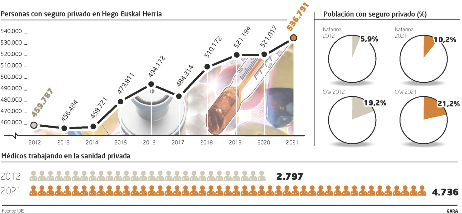 Esta implantación de los seguros privados es desigual en Nafarroa y en la CAV. En Araba, Bizkaia y Gipuzkoa el punto de partida era el de una gran expansión de la sanidad privada. De las 422.050 personas con un seguro en 2012 se ha pasado a las 469.457 en 2021. La subida puede no parecer grande –un 11%–, pero significa que un 21,2% de la población tiene una poliza privada. Más de una de cada cinco personas. En el Estado, la cifra solo se ve superada por Madrid, Catalunya –los dos grandes exponentes de la privatización de la sanidad– e Illes Balears.