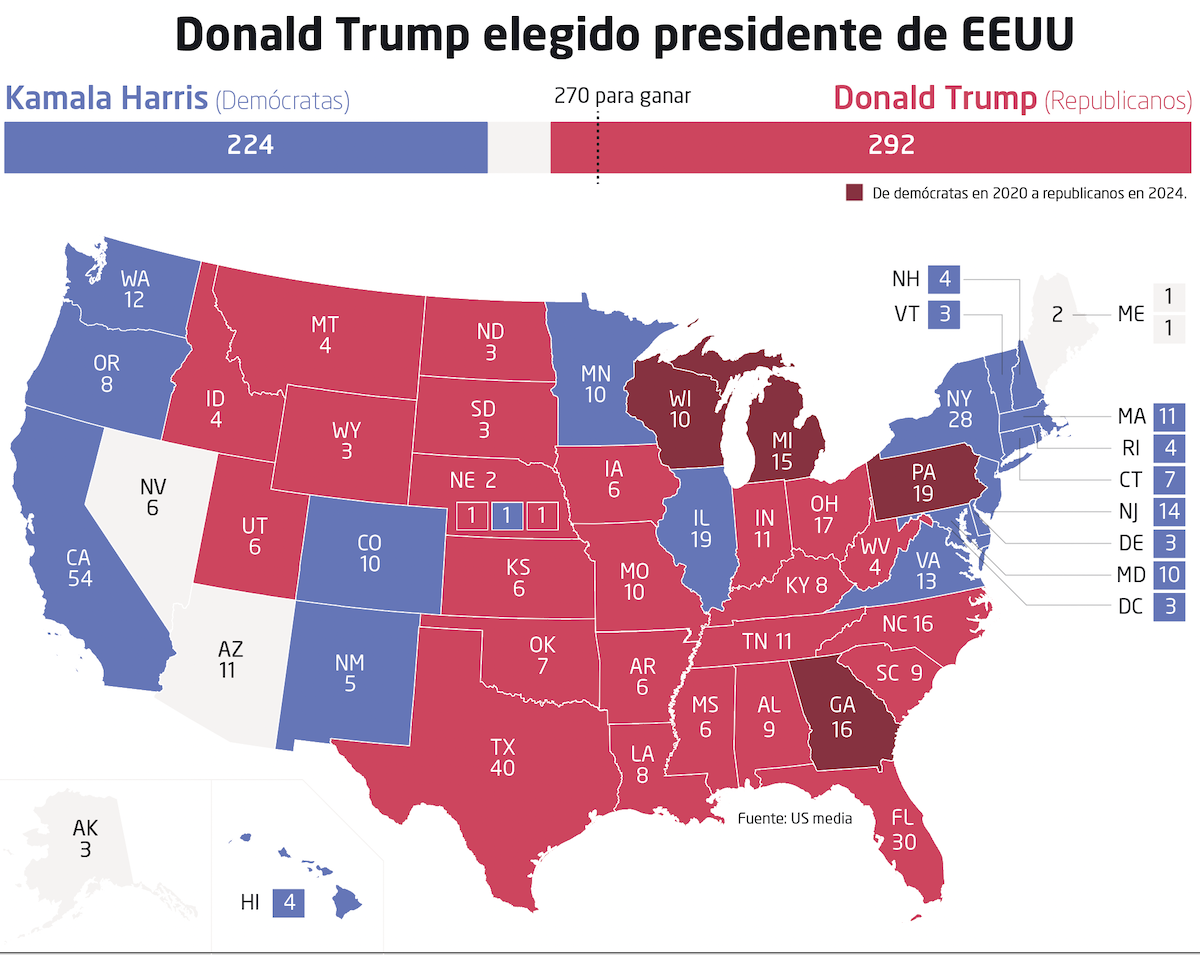 Este organismo está compuesto por 538 delegados, distribuidos en función de la población de cada estado. En la mayoría de ellos, el candidato que obtiene la mayoría, incluso por un solo voto, gana todos los compromisarios de ese estado, a excepción de Nebraska y Maine. El candidato que alcanza los 270 votos gana las elecciones presidenciales, y Trump se hizo ayer con 292, frente a los 224 de la demócrata Kamala Harris.