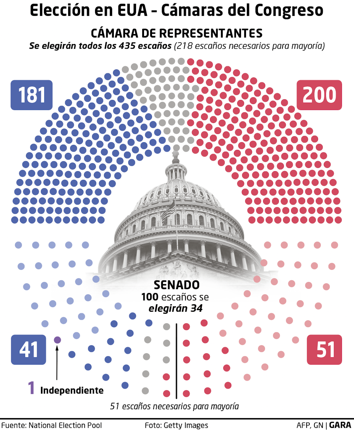 Pese a que la batalla por la Presidencia eclipsó ayer la carrera por ambas cámaras, el desenlace fue igual de favorable para Trump. El resultado de la Cámara de Representantes será el último en conocerse, pero el Partido Republicano se encontraba al cierre de esta edición a 17 asientos de alcanzar los 218 necesarios para la mayoría, con 53 aún por repartir, según AP News.
