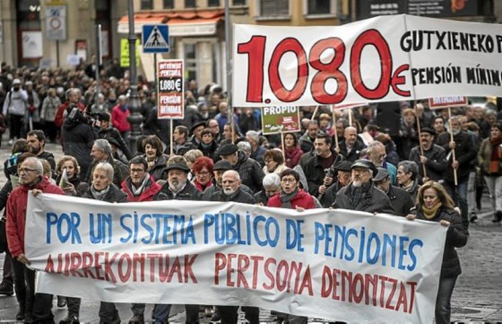 2018 ABEN. 16 MOVILIZACIONES DE PENSIONISTAS EN CAPITALES VASCAS El objetivo siguen siendo los 1.080 € Unos 30.000 jubilados y pensionistas volvieron a ocupar ayer por la tarde las calles de las cuatro capitales de Hego Euskal Herria en defensa de un sistema público de pensiones que garantice unos ingresos mínimos fijados en 1.080 euros al mes para todas las personas. Azken eguneraketa: 2018 ABEN. 16 - 09:14h Nerea GOTI-Ramón SOLA-Martxelo DÍAZ Bilbo, Gasteiz, Donostia e Iruñea acogieron ayer sendas movilizaciones de jubilados y pensionistas en demanda de unas pensiones públicas dignas de al menos 1.080 euros al mes, tras una semana en que la negociación presupuestaria en la CAV ha puesto esta cuestión en primer plano. En Bilbo, la marcha reunió a unas 21.000 personas, según el recuento de GARA (la Policía Municipal cifró 25.000). Acompañada por gaiteros y txistularis, arrancó desde el Sagrado Corazón y concluyó ante el Ayuntamiento. Allí, un mar de puntos de luz, por medio de teléfonos móviles y linternas en alto, despidió la movilización a los sones del ‘‘Txoriak txori”. Los portavoces de la plataforma de colectivos de pensionistas ensalzaron las protestas de las mujeres y de la juventud. «Nuestra lucha es la lucha por la dignidad de las personas», recordaron los oradores, destacando que su campaña persigue blindar las pensiones de hoy y de mañana. Se refirieron también a la prórroga presupuestaria impuesta por Lakua, lamentando que «es una oportunidad perdida para mejorar las condiciones de vida de miles personas, muchas pensionistas». Críticas a Lakua y a Madrid Al comienzo de la marcha, Jon Fano, uno de los portavoces del colectivo en Bizkaia, señaló a GARA que están «muy preocupados por las posiciones que se siguen manteniendo en el Gobierno de Madrid y en el Gobierno de Gasteiz». «Sin duda, lo que ha planteado estos días el Gobierno Vasco, resistiéndose a algo muy elemental, ha sido escandaloso y queremos decirles una vez más a ambos gobiernos que tomen medidas en serio para paliar la situación tan grave de pobreza que están padeciendo más de 150.000 pensionistas, en su mayoría mujeres, en la CAV», destacó Fano. Numerosos colectivos de pensionistas llegados de distintos eskualdes de Bizkaia marcharon con pancartas propias. Pitos, sirenas y equipos de megafonía fueron dejando mensajes durante la marcha. La comparsa Mamiki saludó la llegada de la manifestación a la plaza Elíptica a ritmo de batucada, lo que fue respondido con aplausos y gritos de «Emakumeak aurrera». «Terrorismo es no llegar a fin de mes» o «Gobierne quien gobierne las pensiones se defienden» fueron algunos de los lemas más coreados, así como «Fuera ladrones de las instituciones». Algunos participantes en la movilización de Bilbo exhibieron igualmente carteles con la imagen del rey emérito español, señalando a Juan Carlos de Borbón como «el único jubilado que no está cabreado con la subida de las pensiones». En Donostia, unas 2.700 personas, también según el recuento de GARA, participaron en la movilización, en la que hubo gritos puntuales contra el Gobierno de Lakua y también pidiendo a Markel Olano, diputado general de Gipuzkoa, que «escuche». Los lemas más coreados fueron el citado «Gobierne quien gobierne las pensiones se defienden», «Ez, ez, ez murrizketarik ez» y «Fuera ladrones de las instituciones». Además hubo apelaciones a sumarse a la marcha, sobre todo al pasar por la muy comercial Avenida de la Libertad del centro donostiarra, como «Los de la acera a la carretera» y «Tú que estás mirando, también te están robando». El comunicado de la Plataforma de Asociaciones de Mayores de Gipuzkoa hizo hincapié en la reivindicación de los 1.080 euros y en que «sabemos que hay dinero para pagar las pensiones. Hoy hay más riqueza que nunca, pero las desigualdades crecen. No es un problema técnico, sino de decencia y voluntad política». También se incidió en la necesidad de eliminar la brecha entre hombres y mujeres y en acabar con sueldos laborales indignos que anticipan «más pensiones de pobreza». En Iruñea, un millar de personas, según el recuento de GARA, acudieron a la manifestación convocada por las organizaciones Anapen, Anapp, LAB Pentsiodunak, Lacarra, Pentsionistak Martxan y Sasoia, tras una pancarta en la que podía leerse «Por un sistema público de pensiones. Aurrekontuak pertsona denontzat». En Nafarroa, a diferencia de la CAV, el año termina con un acuerdo presupuestario entre las fuerzas del cuatripartito. Las organizaciones de personas jubiladas destacaron que tanto los presupuestos navarros como los españoles «nacen cojos porque no hay todavía una fiscalidad justa que saque el dinero de donde hay y evite los fraudes». «A la hora de decidir el destino del dinero, hay que priorizar necesidades, partiendo de las miles de personas y hogares que malviven en la pobreza. Tenemos claro que el primer deber de toda gobernanza, por encima del pago de deudas y la condescendencia con quienes poseen la riqueza, debe ser que toda persona viva con dignidad», añadieron, reclamando que los presupuestos se adapten a este objetivo. Por ello, denunciaron que miles de personas viven con pensiones de miseria, especialmente las mujeres a quienes no se ha reconocido el trabajo en casa o en los cuidados y han cotizado en condiciones inferiores. Reclamaron la pensión mínima de 1.080 euros, pero asumieron que transitoriamente puede ser un avance llegar a 900 euros, igual que el salario mínimo interprofesional (SMI). Y reclamaron que se garantice la revalorización según el IPC. En Gasteiz la manifestación reunió a cientos de personas, algo menor que otras anteriores. PENSIONES DEL FUTURO En Bilbo se destacó que la lucha por las pensiones no afecta solo a las actuales, sino que también pelean para que se garanticen las del futuro. En Donostia se denunció la precariedad salarial. Y en Iruñea se rechaz