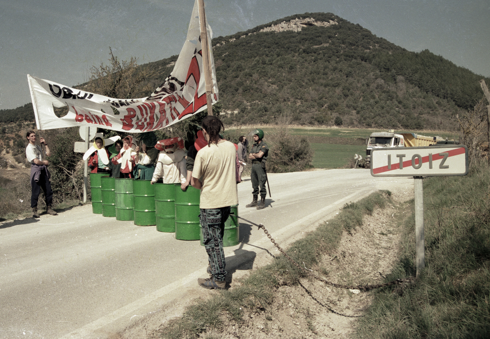 A la hora de la cita, allí solo están los protagonistas, algunos periodistas y un grupo de amigos encartelados tras una pancarta con el lema «Itoitz lurrera. Dani askatu». Las mismas consignas que se escuchaban aquel 12 de marzo, cuando siete plantas crecieron de repente en la entrada a Itoitz y los camiones encontraron la carretera cortada. Solo falta alguien, los tres guardias civiles que entonces llegaron tarde y ahora también.