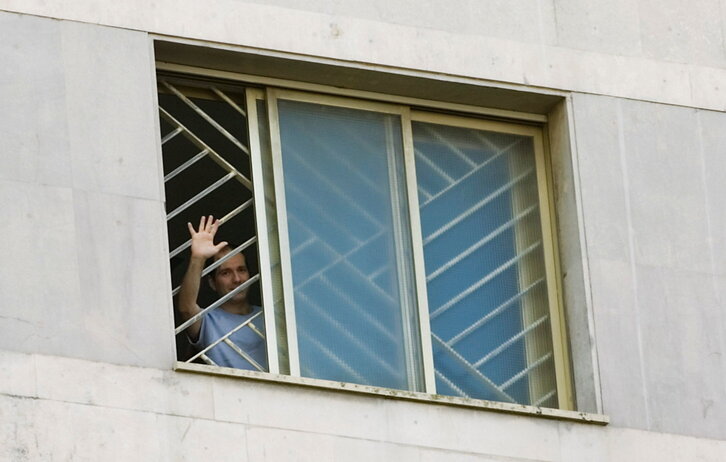 Larriki gaixo dagoen Angel Figueroa euskal presoa Txagorritxuko ospitalean bere alde elkartu den jendea agurtzen.