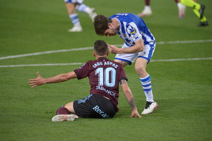 Realaren eta Celtaren arteko futbol partidan Elustondok zerbait esaten dio Aspasi.