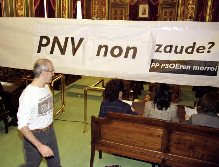 EAJ-PNV itauntzen duen pankarta Bilboko plenoan.