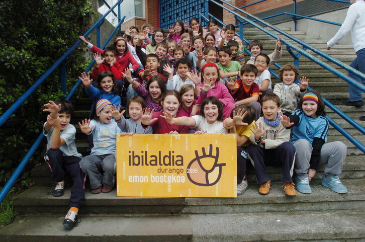Durangoko Kurutziaga ikastolako ikasleak Ibilaldiaren kartelarekin.