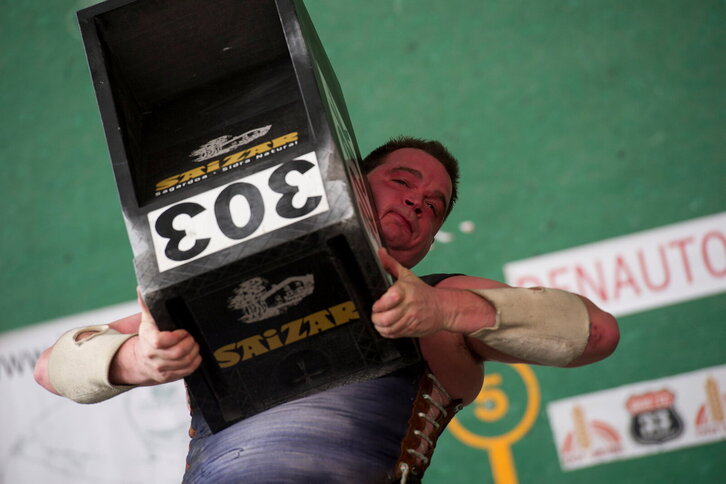 Inaxio Perurenak 303 kiloko harria jasotzen Leitzan.