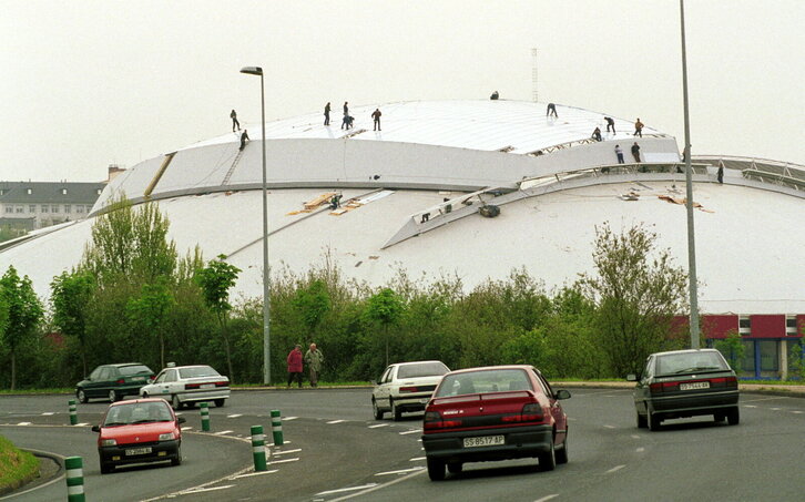 Langileak Ilunbeko zezen plazako kupulan lanean.