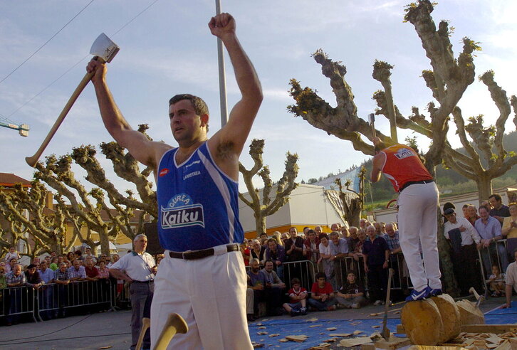 Larretxeak garaipena ospatzen du Lazkaon jokatu den Urrezko Aizkolarien txapelketan.