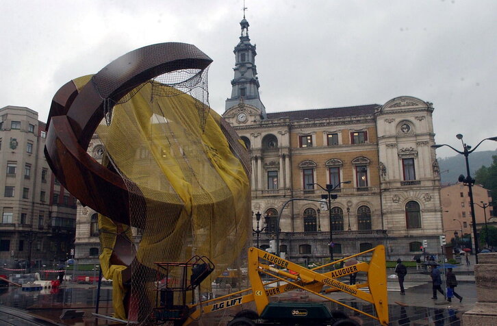 Oteizaren eskultura Bilboko Udaletxearen aurrean.