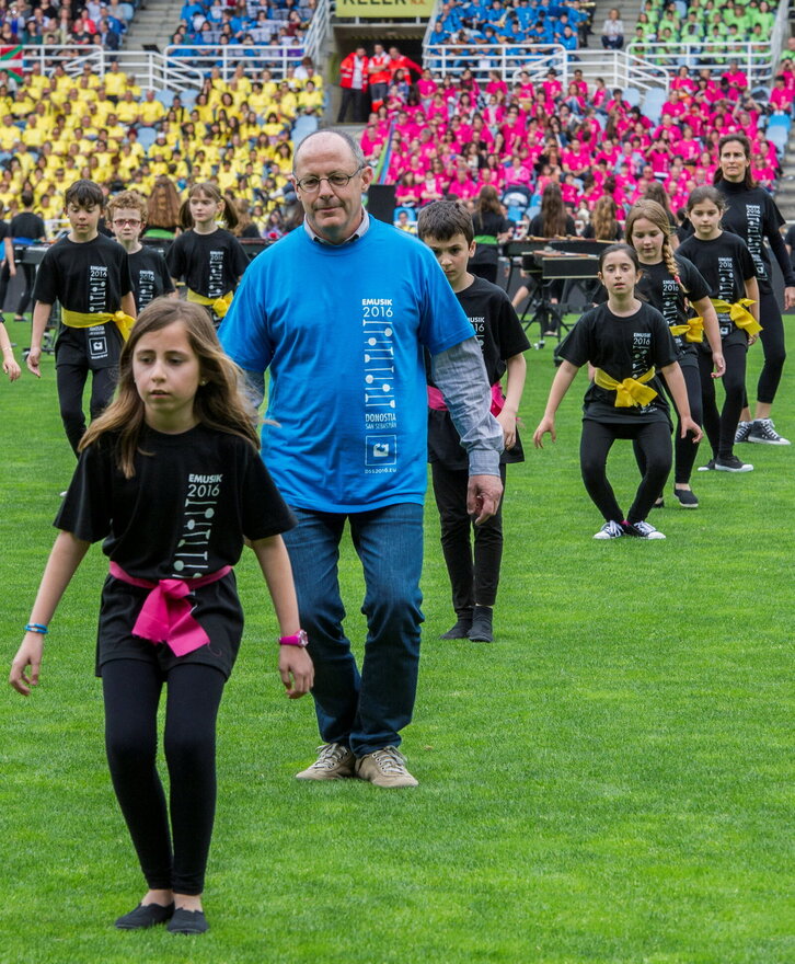 Juan Karlos Izagirre Donostiako alkatea 5.000 musikarirekin batera Emusik 2016 jaialdiaren entsegu orokorrean.