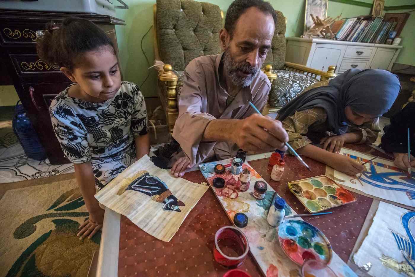 El propietario del taller de papiro Abdel Mobdi Mussalam, de 48 años, dice que hace una década tenía ocho operarios pero ahora solo dos. «El papiro es nuestra única fuente de ingresos. Es lo que me da de comer a mi y a mis hijos», agrega.
