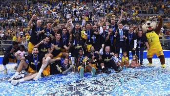 La plantilla de Gran Canaria, con la Eurocup y el billete a la Euroliga en las manos.