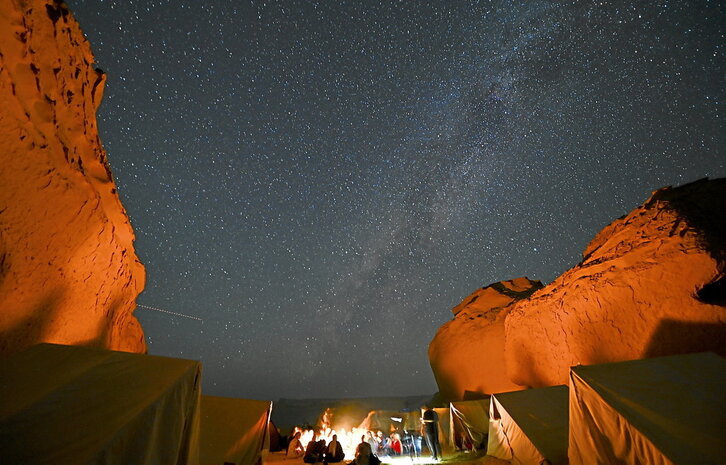 Todos los años, entre el 17 de julio y el 24 de agosto, aparecen las Perseidas, que tienen su pico álgido del 11 al 13 de agosto. Esta lluvia de meteoros surge por la fricción entre pequeñas partículas de roca, hielo o polvo con gases de la atmósfera, provocando momentos de gran belleza. Los astrónomos recuerdan que el lugar de observación puede ser cualquiera, con tal de que proporcione un cielo oscuro, preferiblemente en sitios despejados para la vista y sin contaminación lumínica. En Euskal Herria, el monte es una opción. Una vez allí, lo mejor es tumbarse sobre la hierba y mirar para arriba en la dirección opuesta a la posición de la luna (si es que ha asomado) y, por supuesto, hacerlo sin telescopio, ni móviles. Pero casi todos los años, al menos en la costa, nos quedamos sin Perseidas. La abundante nubosidad, la lluvia, o una luna en cuarto menguante dificultan la observación. No es lo mismo, pero para verlas, hemos recurrido a esta fotografía tomada el pasado 12 de agosto, día de apogeo del fenómeno, en Wadi Al-Hitanque. Ubicado en la gobernación de Faiyum, en el desierto de Egipto, Wadi Al-Hitanque se traduce como Valle de las Ballenas porque contiene fósiles del suborden de los arqueocetos, los antepasados de los cetáceos modernos, primitivos y extintos de cuando el desierto allí estaba cubierto de agua. Es un sitio especial, declarado Patrimonio de la Humanidad por la UNESCO, ideal para ver las Perseidas.