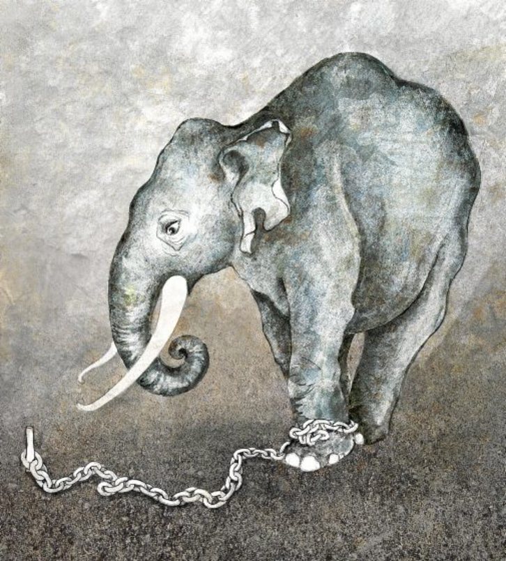 Gaur, jubilatu berri, plazatik igarotzean elefante erraldoi bat ikusi dut belarritik plazako bankuari kate motzez lotua. Bera zen, baina indartsua izan arren, ezin umetako katea hautsi.