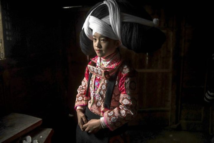 Lasai dago Longjia txinatar herriko neskato hau, esperoan. Ilargi-urte berriko Loreen Dantzetan parte hartuko du aurki, aurretik bere amak egin zuen legez eta, bere aurretik, haren amak. Denboraren lanbroan galtzen den kate luzeko katebegia da daraman janzkera; lore txiki eta finez brodatutako soinekoa eta buruko handia, bere herriaren nortasunaren ikurra. “Emakume adardunak” deitzen baitiete hego-mendebaldeko Txinako miao etniako emakumeei. Ezizena burukoetatik datorkie, noski. Handia eta beltza da, eta animalien adar handi biren inguruan estu lotutako ileorde antzeko honetan artilea, lokarria eta dagoeneko beraien artean ez dauden amonen ileak biltzen dituzte. Belaunaldiz belaunaldi gordetako buruko hauek jai guztietan janzten dituzte, arbasoak gurtzeko eta, bide batez, haien kulturako ohiturak modernitatearen uholde bortitzetik babesteko. Txinako Herri Errepublikako 1.400 milioi biztanleetatik, bederatzi milioi miao etniakoak dira –onespena duen gutxiengo minorizatu bakarrenetarikoa da– eta gehienak hego-mendebaldean bizi dira; 5.000 Guizhou menditsuko hamabi herri isolatutan, argazkiko neska bezala. Agian bere jantzia ezaguna egingo zaizue, Clint Eastwooden “Gran Torino” (2008) filmagatik. Bertan bi gazte hmong ziren protagonista; hau da, Vietnamen CIA estatubatuarrak erabili zituen miao etniakoak. Thailandian eta Guyana Frantsesean ere miao edo hmongak bizi dira.