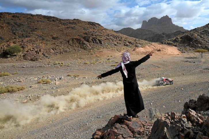 Martin Prokop gidari txekiarra abiada bizian igaro da Saudi Arabiako lurretatik 2020ko Dakarren, Viktor Chytka kidea ondoan duela. Bolantearen norabideaz arduratzen da bata, eta norantz bira egin behar duen ohartaraztea da bestearen eginbeharra. Bitartean, haien gurpilen azpian ziztu batean atzean geratzen ari da Saudi Arabiako lur mortua.