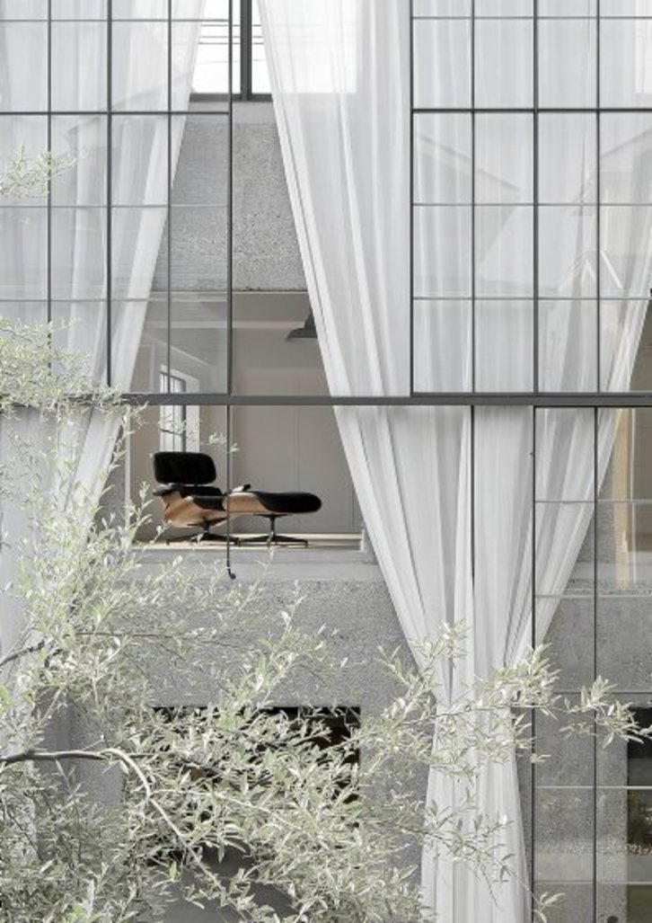 Vibraciones. Las sombras y reflejos ondulantes constantes crean un efecto vibrante por medio de la luz, tanto hacia el interior como hacia el exterior. Por el contrario, las ventanas a ambos lados del bloque son simples elementos fijos convencionales con marcos de acero. En el frente que da a la carretera, la fachada alude a su existencia pasada, con paredes pintadas de gris y los marcos de las aberturas anteriores. Sin embargo, en ese contexto suburbano, esa transformación de las fachadas genera una situación inquietante.