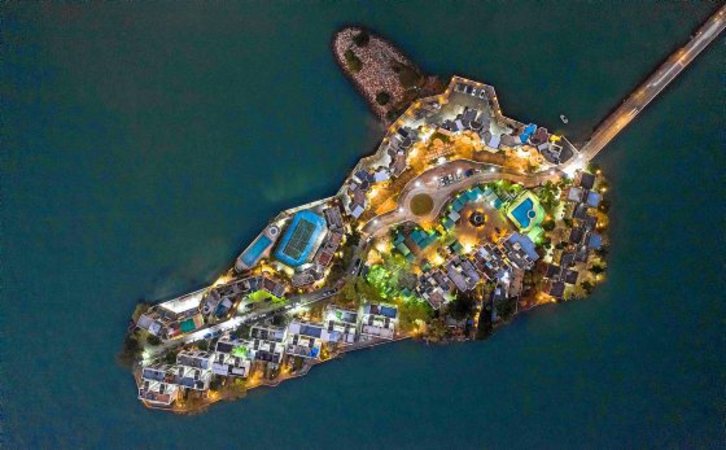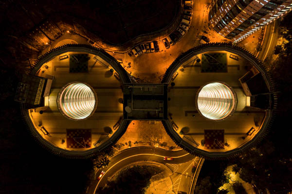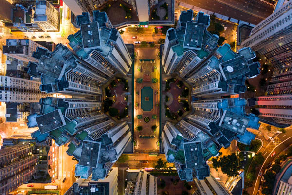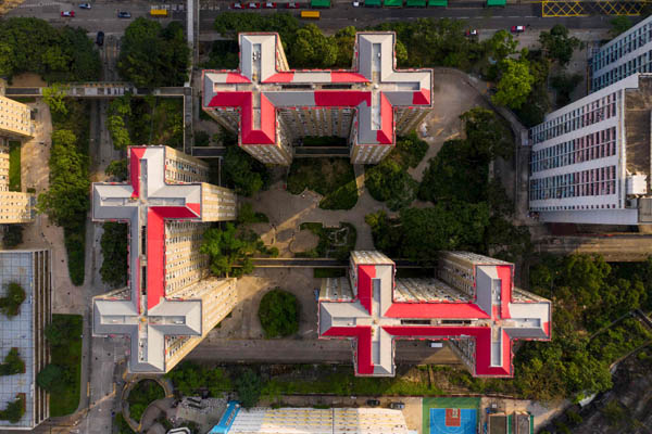 Abriendo este fotoreportaje, imagen aérea de una isla en Hong Kong. Junto a estas líneas, azoteas de varios edificios que forman singulares formas geométricas.