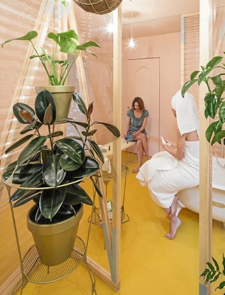 Los autores han denominado “bathyard” (unión de bath –baño– y “courtyard” –patio–) a un nuevo tipo de espacio que crea un nuevo “exterior” dentro del propio edificio. El baño se coloca en mitad de la casa, ocupando un gran espacio, y se abre al patio de ventilación del sur. En un calurosísimo Madrid, el fenómeno de isla de calor hace que la ventilación cruzada sea fundamental para pasar la primavera y el verano, casi a modo de soluciones bioclimáticas tropicales. Para conseguir esto, se abre la casa al patio del sur a través de una antesala del baño, donde se colocan las plantas que acompañaron a la propietaria en su viaje de los suburbios a la ciudad, y se abre una ventana en forma de óculo en una de las paredes maestras del edificio, para garantizar el fluir de un aire húmedo que refresque todo el piso.