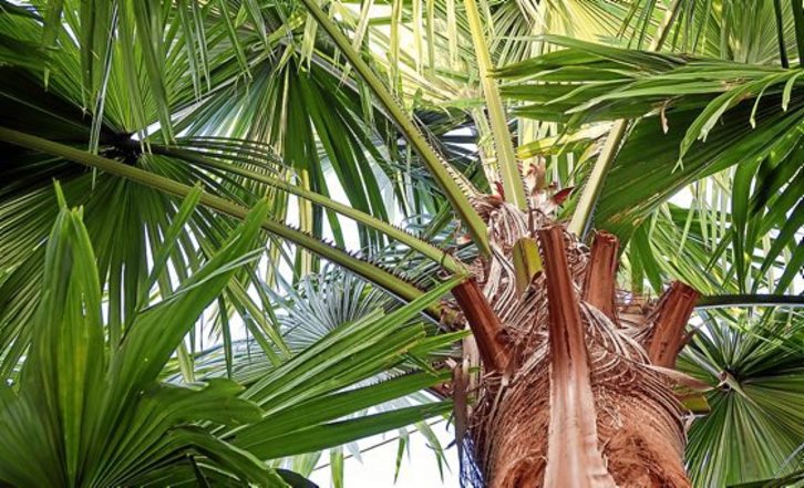 Palmera china o Livistonia chinensis; resulta interesante porque crece dos o tres veces menos rápido que otras variedades. Puede vivir años en un tiesto grande, que en invierno habrá que cambiar de sitio para protegerla del frío y mantener el suelo fresco, incluso con acolchado, si fuese necesario.