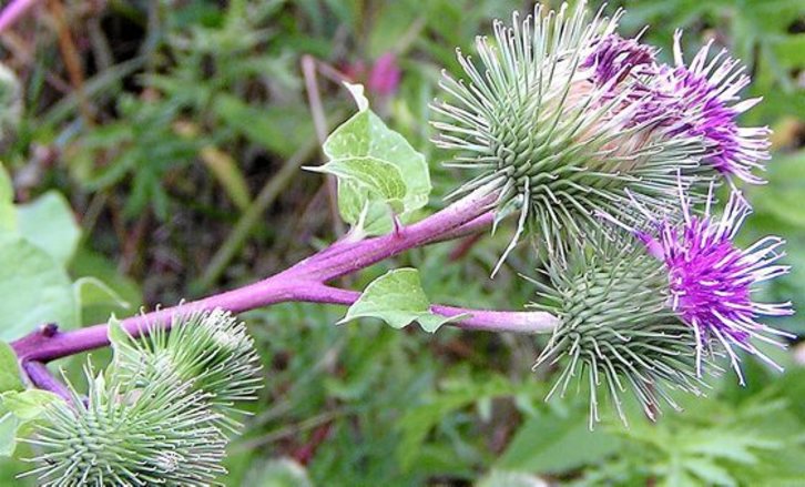 De niños ya conocíamos la bardana (Arctium lappa). Sabíamos de sus bellas flores azules y pinchosas, y de sus frutos: una bolitas con ganchos difíciles de desprender de jerséis, perros lanudos y corderos y también de nuestro pelo si lo llevábamos largo.