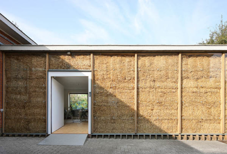 Para ello, se usó una técnica consistente en crear muros de cerramiento rellenos de paja y marga, es decir, adobe. El material, local y fácilmente manipulable sin peligro y sin conocimientos de construcción previo, permitió, siempre con una supervisión de profesionales, que las personas allegadas se sintieran parte del proyecto y la casa se construyera no solo en el plano material, sino también en el de las emociones y los recuerdos.