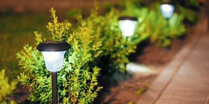 Otra solución es la luz solar, se compone de células fotovoltaicas pequeñas que se cargan durante el día e iluminan automáticamente durante la noche. La intensidad luminosa es débil pero, utilizando leds más potentes, su eficacia mejora. Se utiliza para señalar un camino, poner en valor plantas especiales, en guirnaldas, incluso para iluminar un estanque. Duran mucho tiempo sin gastos de electricidad.