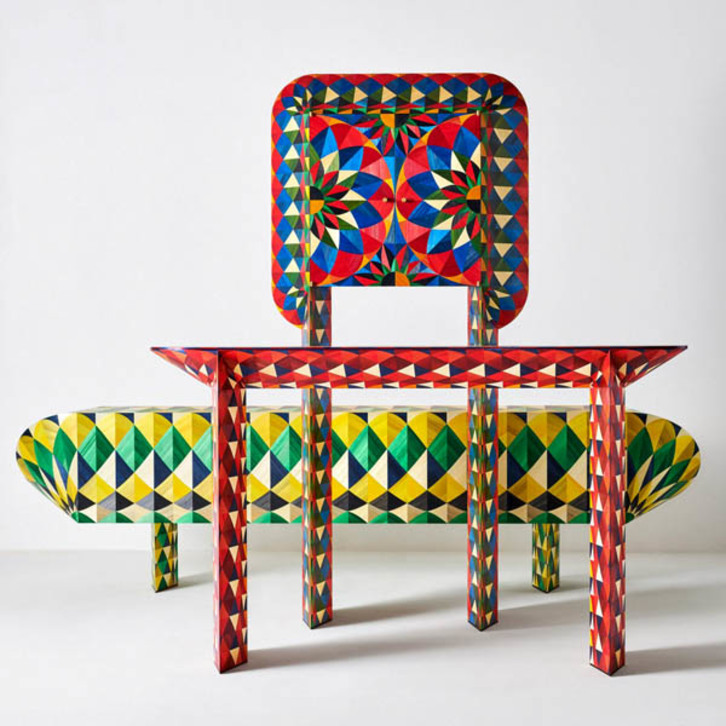 Dicen que el Palacio de Versalles es el máximo exponente de la decoración de muebles y pavimentos, pero la nueva colección de Adam and Arthur es tan espectacular como los famosos salones parisinos. Exquisite Corpse consta de tres muebles hechos a mano decorados y se presenta como una versión moderna de la marquetería de paja. La colección lleva el nombre del juego de salón francés Cadavre Exquis, inventado por miembros del movimiento de arte surrealista de vanguardia en 1925. «En el juego, un jugador dibuja una parte del cuerpo u otra imagen en un trozo de papel antes de doblar el papel para ocultar lo que ha dibujado y pasarlo al siguiente jugador, y así sucesivamente», explica Arthur Seigneur. «Las figuras completas son tremendamente inventivas y con frecuencia, extrañas, pero este juego resume nuestro proceso de colaboración y captura la maravillosa tensión en nuestra toma de decisiones conjunta», prosigue. Las formas, los patrones y los colores llevan a otro nivel este tipo de marquetería y, para conseguirlo, el dúo de diseñadores ha trabajado con artesanos franceses. Como ellos mismos explican entre risas, «les hemos vuelto locos». En la pieza más grande se han empleado más de 14.000 pajitas teñidas y, para poder fabricarla, han tenido que desarrollar técnicas y herramientas personalizadas para poder aplicar patrones curvos a formas tridimensionales. Conscientes de que las piezas no son accesibles para todos los bolsillos, nos permiten evolucionar una técnica que estaba en desuso y que corría el riesgo de desaparecer. En nuestra sociedad consumista y post industrializada los objetos deben fabricarse cada vez más rápido. «La marquetería de paja tiene el lujo de ser todo lo contrario; su largo proceso de preparación y aplicación artesanal se rebela contra las limitaciones de tiempo». www.adamandarthur.com