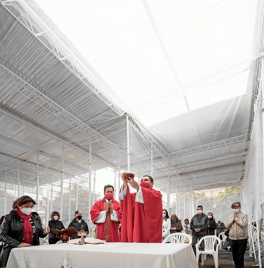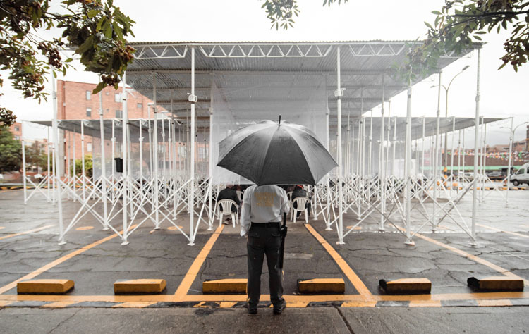 Atravesada por una tercera ola, y con los servicios sanitarios colapsados, en un país fervientemente católico, la falta de lugares de culto suponía un problema grave. La Archidiócesis de Bogotá plantea el proyecto para una nueva parroquia temporal, llamada Santa María de la Alhambra, abierta a la calle y planteada con un presupuesto de emergencia.