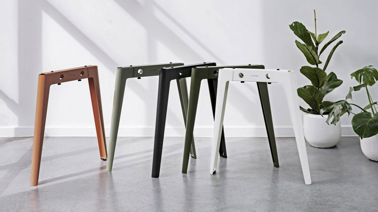 Las tapas están revestidas en madera de pino certificada FSC con chapa de roble de diferentes colores, o en plástico reciclado similar al terrazo hecho de cientos de tarros de yogur desechados. Las patas de acero se pueden recubrir con pintura en polvo en cinco acabados diferentes: blanco nublado, negro grafito, verde romero, gris eucalipto y rosa ceniza, que son los más vendidos de la marca. www.tiptoe.fr