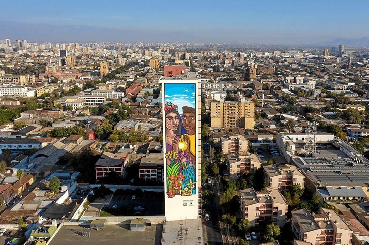 En un edificio del barrio Yungay de Santiago de Chile, STFI Leigthon ha pintado este mural como parte de la campaña «Rompiendo barreras por la igualdad de género». La artista chilena –que desde 2013, entre otras cosas, ha dejado su impronta con 40 murales repartidos entre ocho países de Sudamérica y Centroamérica– es autodidacta y partidaria de la multiculturalidad. Lo ha dejado claro llenando de color un total de 26 pisos y convirtiendo el mural en uno de los más altos de Chile, como bien se puede apreciar en esta vista aérea. Indudablemente, STFI Leigthon ha conseguido dar visibilidad a un asunto fundamental y ha ido más allá abogando también contra la desigualdad económica y social, que en su opinión requiere «una transformación urgente y necesaria», ha dicho.