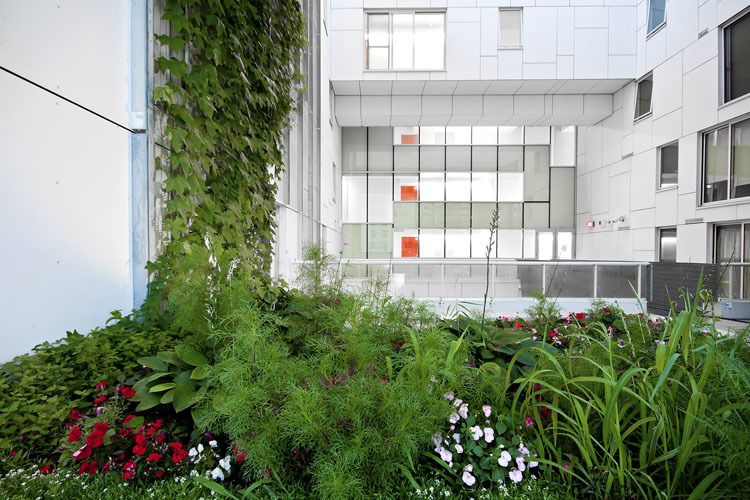 El resultado es, a pequeña escala, un ecosistema completo que sus autores describen como permacultura urbana; el restaurante y la cocina, que se encuentran en la planta baja, se surten con verduras, frutas y hierbas aromáticas que crecen en la terraza del sexto piso. El huerto es regado por las aguas pluviales recogidas y almacenadas en las cubiertas del edificio, y los residuos orgánicos generados en las cocinas sirven como abono para el jardín.