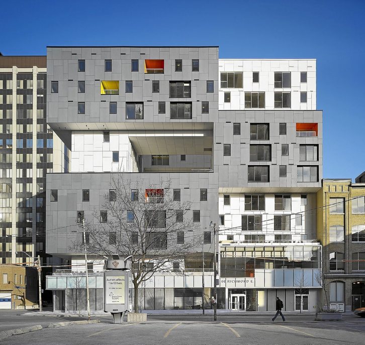 Uno de los últimos proyectos de Teeple Architects, un bloque de vivienda colectiva en Toronto, lleva este concepto a la arquitectura. Con once plantas y ochenta y cinco viviendas, es además una de las primeras cooperativas de viviendas que se construyeron en la ciudad canadiense.
