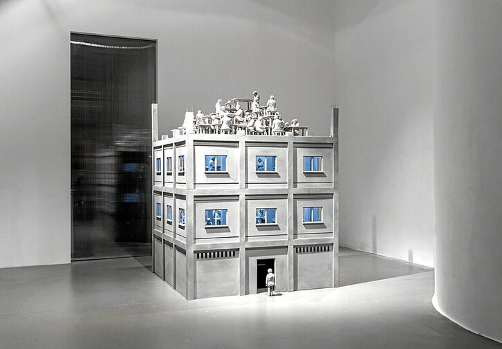 El pasado 17 de diciembre, la galería SC Gallery de Bilbo inauguró una nueva exposición del artista Isaac Cordal (Galicia, 1974). La muestra, que podrá visitarse hasta el día 28 de este mes, supone la segunda participación individual de Cordal en el espacio bilbaino y lleva como título “24/7”. Un juego de cifras que se utiliza como expresión para referirnos a la dedicación completa del tiempo (24 horas, 7 días a la semana). En ella encontramos una mezcla entre escultura y maqueta. Como si fuera el escenario de grabación de una película de animación, el artista nos presenta de una manera quizás algo naíf una serie de personajes a pequeña escala que convierten a la galería en un gran escenario, en lo que supone una de las prácticas habituales de Cordal. Precisamente el diseño de las figuras y esta diferencia de tamaño nos permite introducirnos en un lenguaje que entendemos próximo y que nos identifica con las acciones que suceden. Nos topamos con rostros alicaídos dominados por la penumbra. Escenas oníricas que enfatizan una manera de relacionarnos con la vida basada en la dedicación constante a los tiempos productivos dominados por la alienación. Miradas vacías y solitarias que descansan en cajoneras convertidas en edificios. Habitáculos de descanso para las piezas de un gran engranaje que no descansa y que nos obliga a estar siempre alimentando la llama. De todas las piezas emana una atmósfera de soledad y rostros inexpresivos que simplemente se dedican a pasar por la vida que les ha tocado, sin otra opción que despertarse al día siguiente para seguir acudiendo puntual al inicio de una nueva jornada y esperar a que pasen los días mirando a un cielo gris. En algún momento alguna de las caras de los personajes puede que empiecen a parecerse sospechosamente a las nuestras, ¿no os parece?