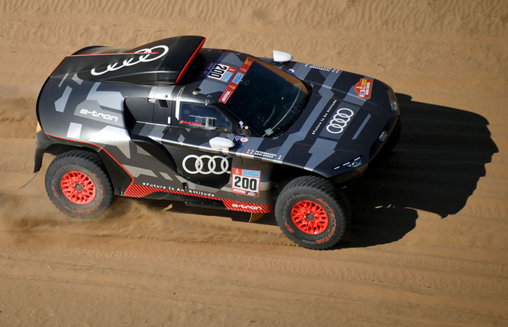 Uno de los fabricantes que más ha apostado por ello es Audi, que regresa a los rallys con tres unidades del revolucionario RS Q e-tron. Un vehículo de aspecto futurista que no es 100% eléctrico, habida cuenta de que las etapas del rally tienen entre 400 y 800 kilómetros, una distancia que requeriría baterías enormes y de gran peso, lo que haría inviable la carrera.