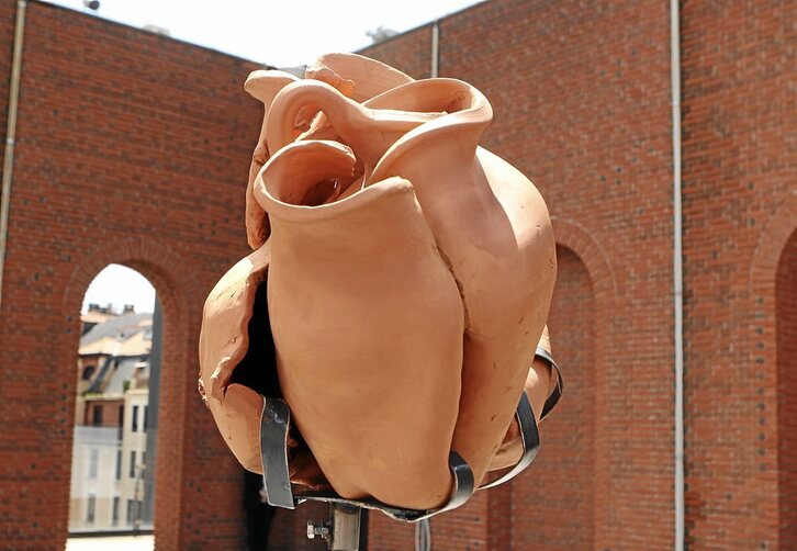 El pasado 9 de junio Azkuna Zentroa Alhóndiga de Bilbo inauguró una nueva propuesta escultórica a cargo del artista Antonio Fernández Alvira (Huesca, 1977), que podrá visitarse hasta el próximo 30 de octubre. El escenario elegido para la instalación de “Memoria de forma” es la terraza del centro y esta condición ha influido directamente en la creación de la misma. El artista realizó una labor de investigación sobre los usos del edificio hasta dar con una de las funciones que más le interesó. El mítico edificio era utilizado como contenedor de vinos y aceites y Fernández Alvira parte de esta premisa para su desarrollo formal. Entendiendo el poso de esta identidad desarrolla una instalación en la que varias vasijas de barro, de una gama cromática en relación con el ladrillo rojizo de la estancia, se contorsionan entre estructuras de metal hasta perder su forma original. Una traslación del objeto útil al objeto poético que si bien ya no puede transportar mercancías, nos remonta a una memoria del propio lugar.