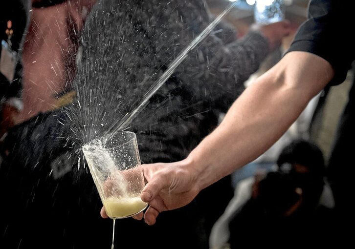 Seguimos con el proceso. Dejando el mosto de manzana en el altar que se merece, pasamos a terminar de elaborar la sidra. El mosto se deja reposar para que decante la parte sólida y se “limpie” un poquito. Una vez el mosto está “limpio”, llega el momento de fermentar, el momento en el que los azúcares del mosto pasan poco a poco a transformarse en alcohol y se va generando el carbónico (la txinparta). Pasado este punto, se puede realizar el trasiego, momento en el que se mezclan las sidras de diferentes kupelas (barricas) para dejar que evolucionen. Desde este momento podemos hacer el ¡TxoTx! El siguiente paso sería el embotellado y su futura conservación. Obviamente no es lo mismo hacer sidra en un baserri que en una sidrería que cuente con instalaciones “modernas” para la elaboración de la sidra, pero la magia de la manzana se vive en ambos casos.