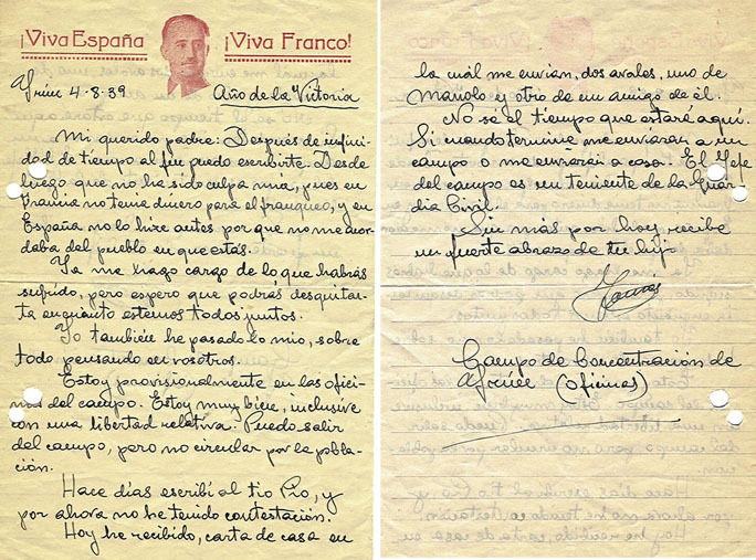 Abuztuan idatzi zion lehen aldiz aitari kontzentrazio esparrutik. Gutunean zehazten da esparruko bulegoetan zegoela «behin-behinean». Baita ere, askatasun erlatiboa zuela. «Esparrutik irten naiteke, baina ez hiritik mugitu». Hala ere, ez zekien zenbat denbora igaroko zuen esparrua, ezta ere bere helmuga. «Ez dakit zenbat denbora igaroko dudan hemen. Ezta, esparru batera bidaliko nauten ala etxera». Gutunak ez zuen erantzunik jaso. Ondorioz, zortzi egun beranduago, ama eta arrebei idatzi zien.