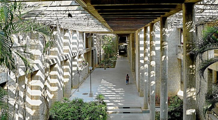En 1983 finalizó el Instituto Indio de Administración en Bangalore, un proyecto que explora el concepto de diseño de aulas interiores y exteriores. El campus fue concebido como un lugar para ser habitado y facilitar el transcurrir de la interacción humana. Como el propio Doshi afirmaba, un campus debería estar siempre serpenteando y conectando a los usuarios con su espacio, permitiendo las reuniones informales en las que compartir el conocimiento adquirido. En ese sentido, el edificio aparece como un templo antiguo, como una ruina rodeada por la naturaleza, que construye ese espacio común.