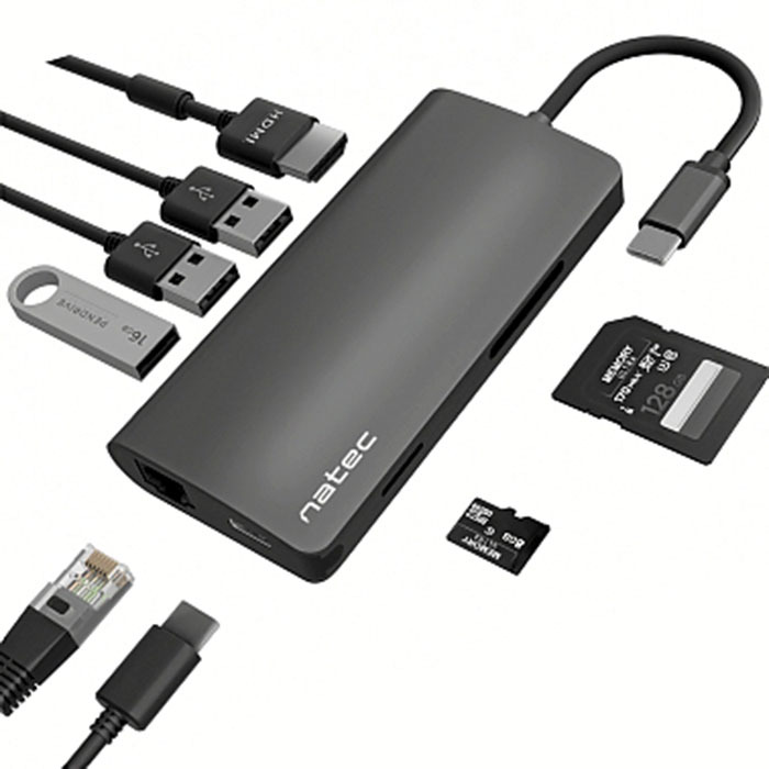 Natec ofrece en su catálogo este adaptador USB-C multifuncional que proporciona ocho puertos adicionales para portátiles o smartphones que necesitan ampliar su conectividad añadiendo un puerto Ethernet, un HDMI, lector de tarjetas MicroSD y SD o puertos USB-A.