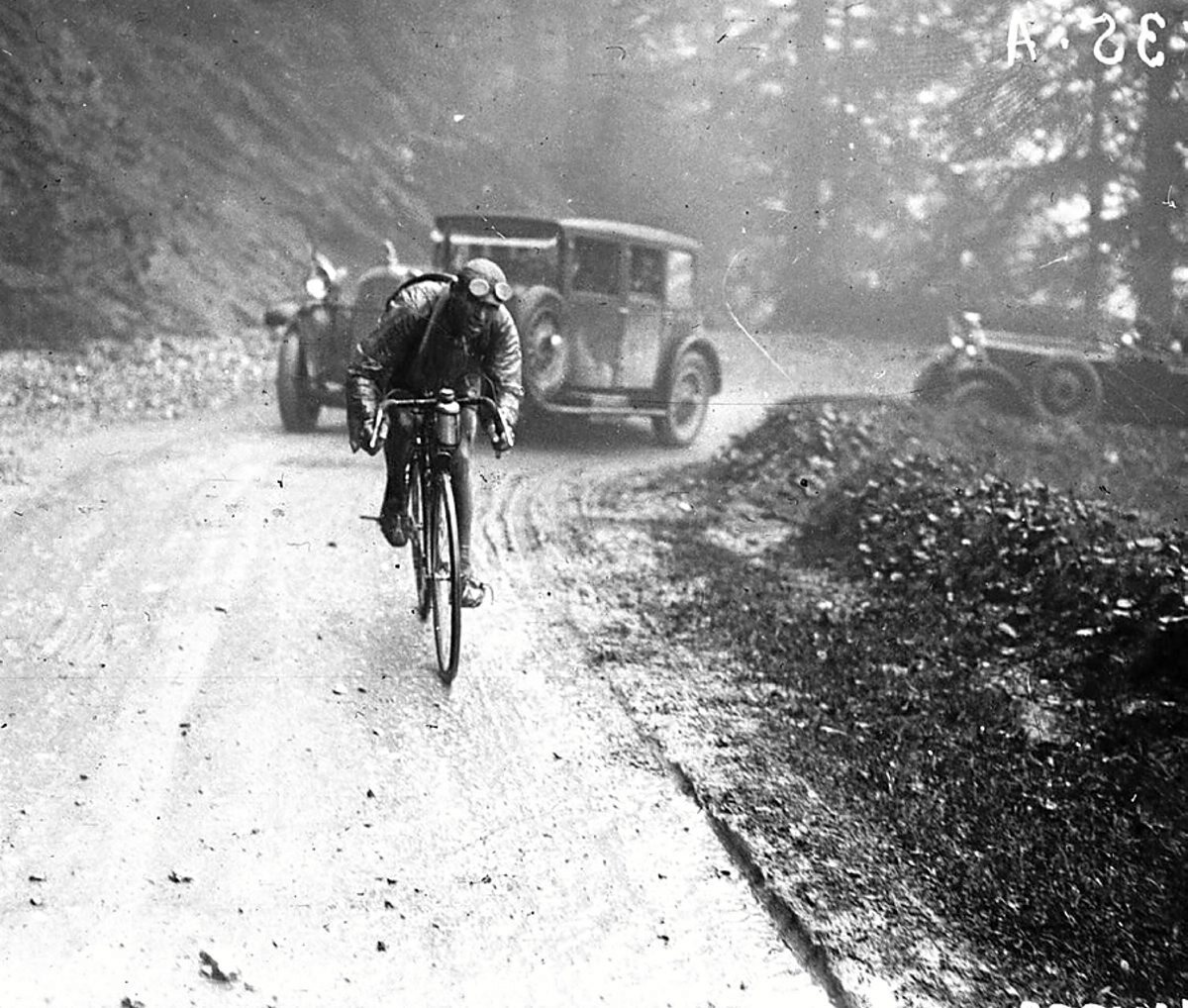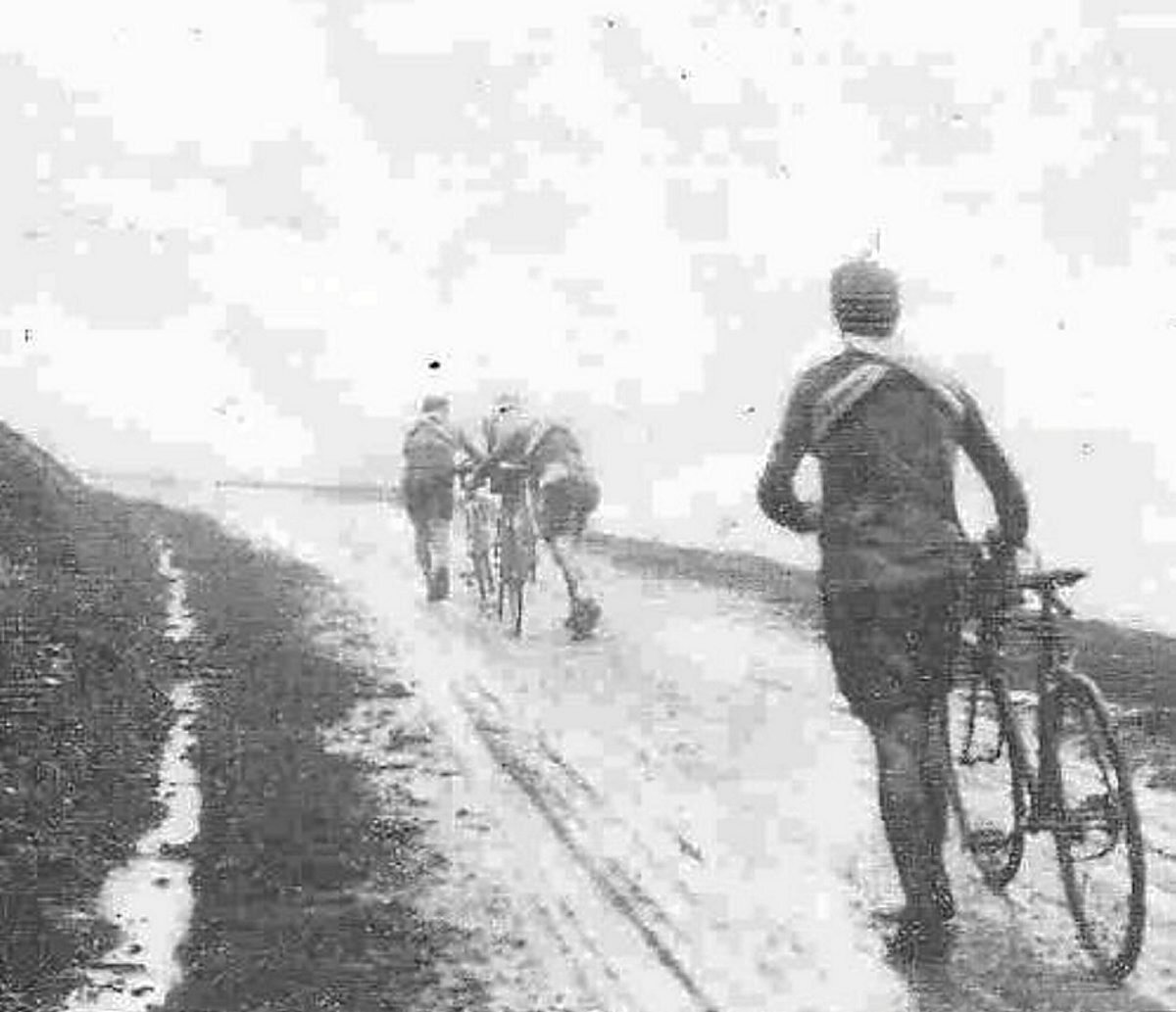 Las primeras gotas llegaron en Laruns, con las rampas iniciales del Aubisque. Olvídense del cambio electrónico. Por aquel entonces, los ciclistas se debían bajar a toda prisa de la bicicleta para girar su rueda trasera y poner un desarrollo más adecuado a los desniveles que debían afrontar. A partir de Eaux-Bonnes, la tormenta convirtió el camino –sterrato lo llamaríamos ahora–, en un río de lodo. «En el camino a los puertos, ahogados por nubes o neblina, la visibilidad no superaba los 50 y a veces los 30 metros», contó entonces Gabriel Hanot, periodista del “Mirror of Sports”.