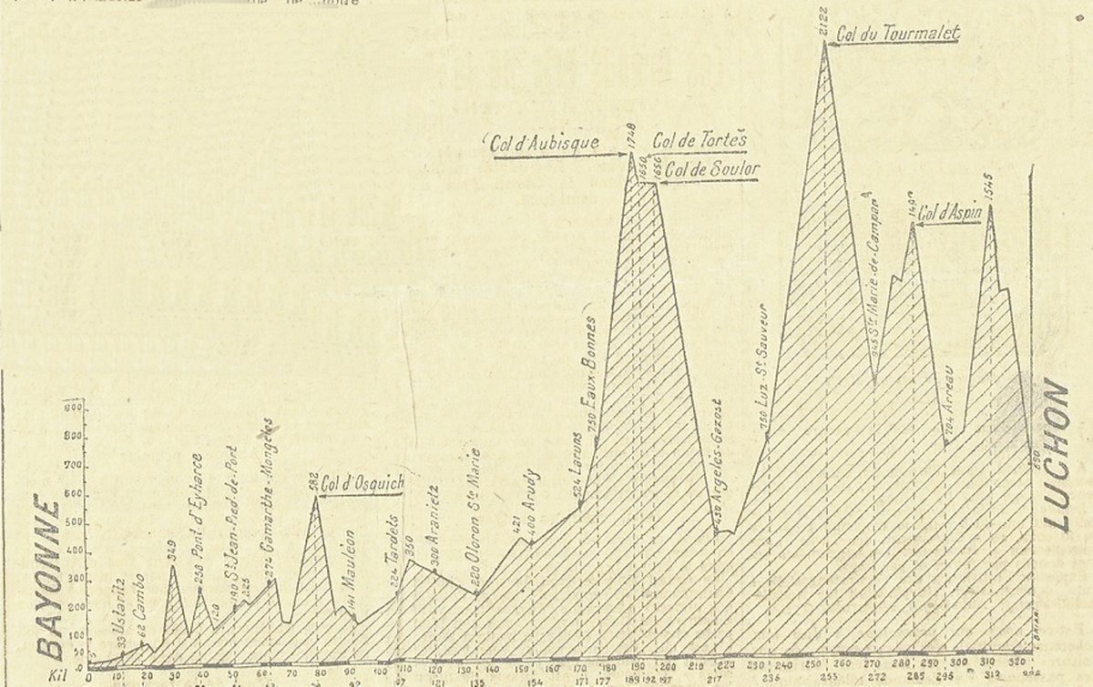 En 1920, la etapa más larga de la historia del Tour terminó en Baiona tras 482 kilómetros. Con ese récord en el bolsillo, la localidad vasca se propuso contar también con la jornada más dura de la historia. El 6 de julio de 1926, la 10ª etapa del Tour salió de Baiona. Y está considerada como la más dura en sus 120 años de historia. La etapa podría dividirse en dos partes. La primera, nada menos que 190 kilómetros llanos (solo dos etapas de la edición de 2023 superan ese kilometraje), a lo que le seguían casi 140 kilómetros más en los que superar Aubisque, Soulor, Tourmalet, Aspin y Peyresourde. En total, más de 6.000 metros de desnivel. Sin embargo, ni los puertos ni la longitud (no eran pocas las etapas de más de 400 kilómetros) fueron las mayores dificultades de aquella jornada.